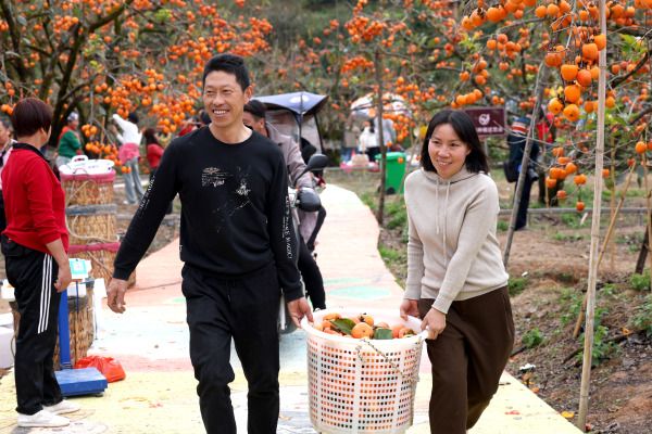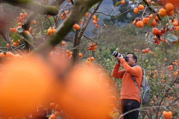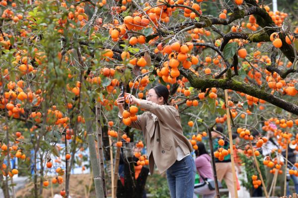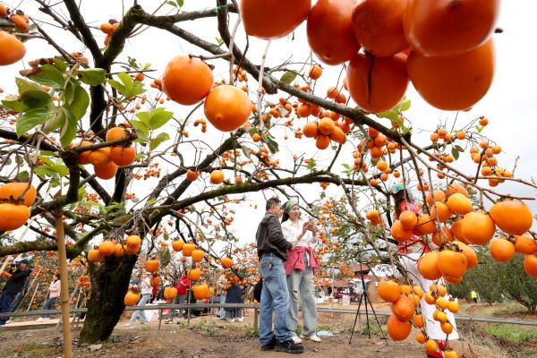 2023年11月12日,福建宁德,游客在古田县利洋村柿子园游玩、拍照。