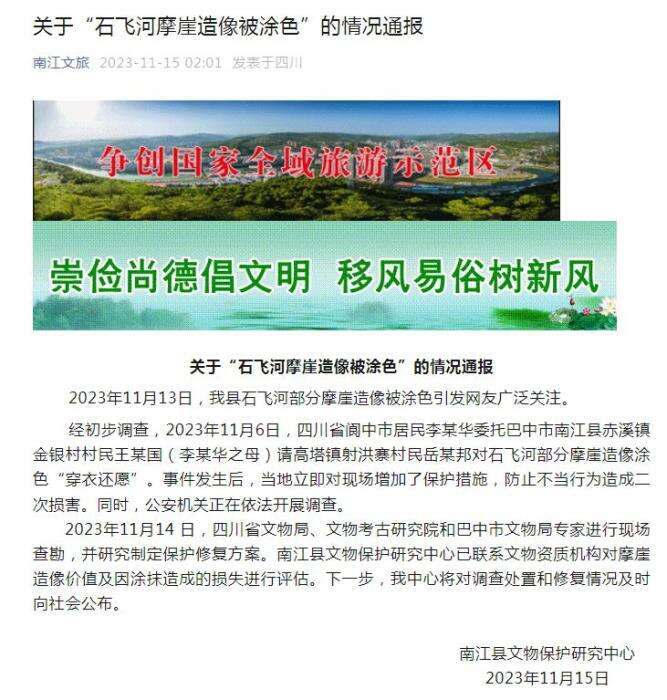 通报指出,11月13日,南江县石飞河部分摩崖造像被涂色引发网友广泛关注。经初步调查,2023年11月6日,四川省阆中市居民李某华委托巴中市南江县赤溪镇金银村村民王某国(李某华之母)请高塔镇射洪寨村民岳某邦对石飞河部分摩崖造像涂色“穿衣还愿”。事件发生后,当地立即对现场增加了保护措施,防止不当行为造成二次损害。同时,公安机关正在依法开展调查。