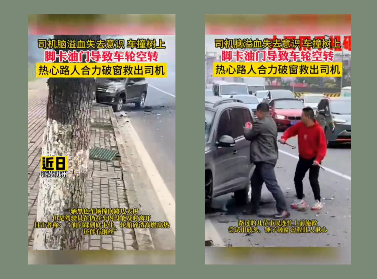 近日,江苏,一驾驶员脑溢血失去意识,导致车辆失控撞树上,司机脚踩油门未松开,导致油箱破裂、车轮空转,热心路人合力破窗拉出司机并报警。网友:感谢你们,仗义出手,救人于危难!