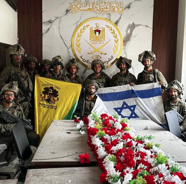 报道援引了以军发布的一张照片,照片显示多名以军士兵在宪兵总部举着以色列国旗。报道说军方没有标明照片的拍摄时间。