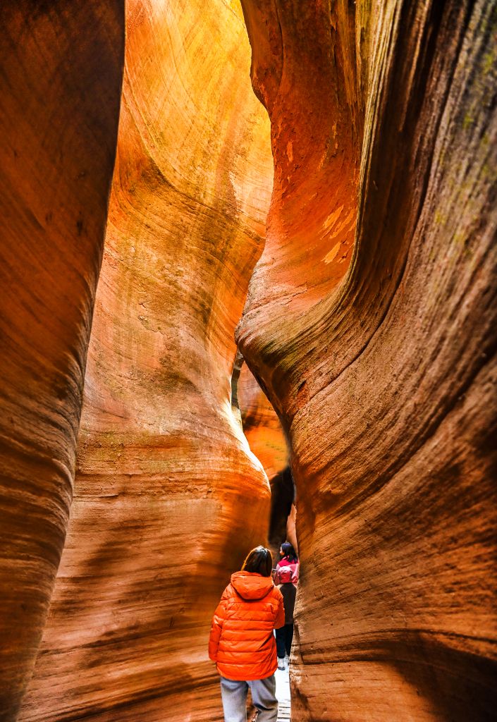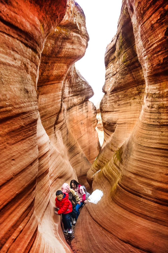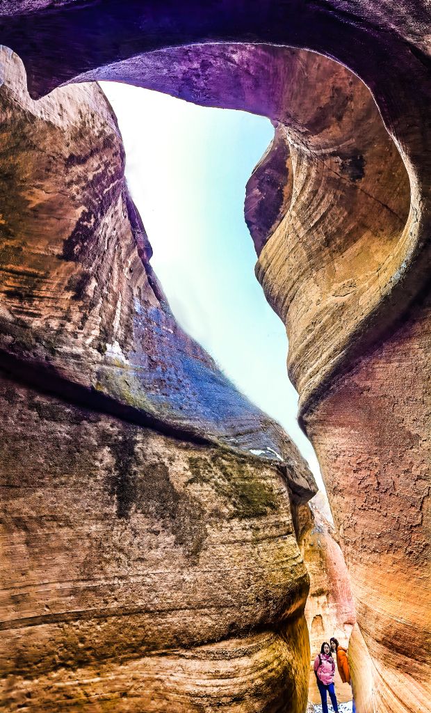 令人惊奇的是每个景点的首尾区域,都有一段可容纳几十人地盘休息的天然露天空地,仰目这片浩大的天空给足了游人的吸氧间歇放松的空间,也让观赏的视觉得到暂时的休憩。由于峡谷地势较低,行走时常常是由宽变窄,时有旱路、时有浅坑。据了解,这里雨水充沛,红沙岩的沟谷总与苍翠欲滴的绿草和地毯感觉的鲜嫩苔藓相陪伴、相衬托,加上太阳光波的长短、色温的变化,让峡谷的两侧色彩如同斑斓的光谱,蕴含出绚丽灿烂的多彩世界。