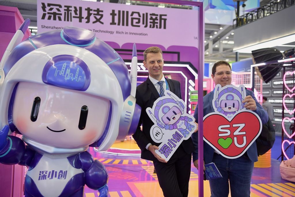 2023年11月15日,深圳,第二十五届中国国际高新技术成果交易会(简称高交会)拉开帷幕。本届高交会以“激发创新活力 提升发展质量”为主题,吸引了100多个国家和地区的4000多家企业参展。图为外商与IP形象“深小创”合影留念。中新社记者 陈文 摄