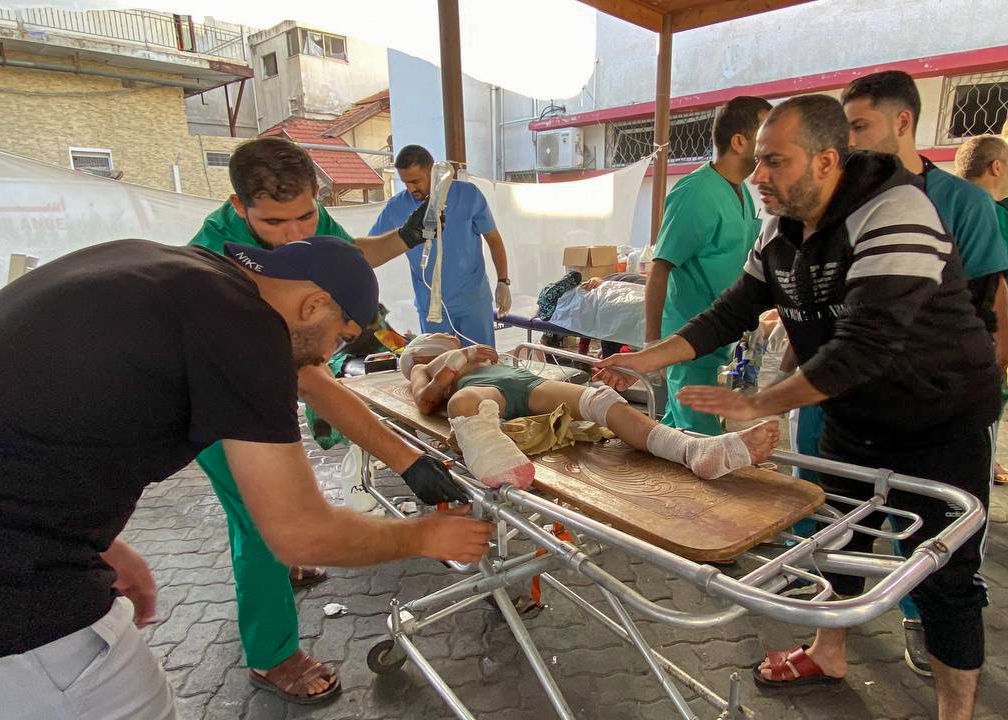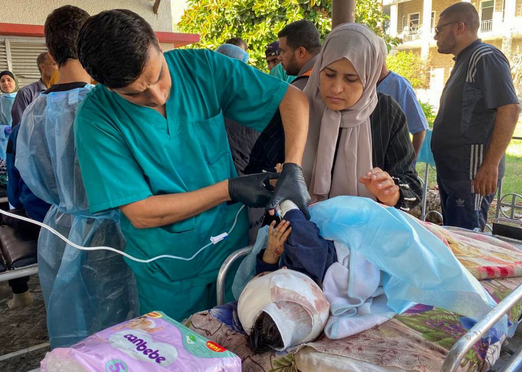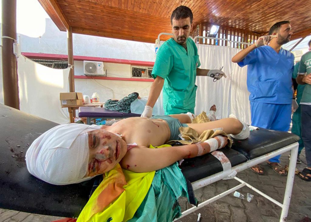 当地时间2023年11月15日,加沙地带,巴以冲突持续近40天,医院的一些部分被摧毁,医护人员在阿赫利阿拉伯医院外治疗受伤的巴勒斯坦人,其中包括儿童。