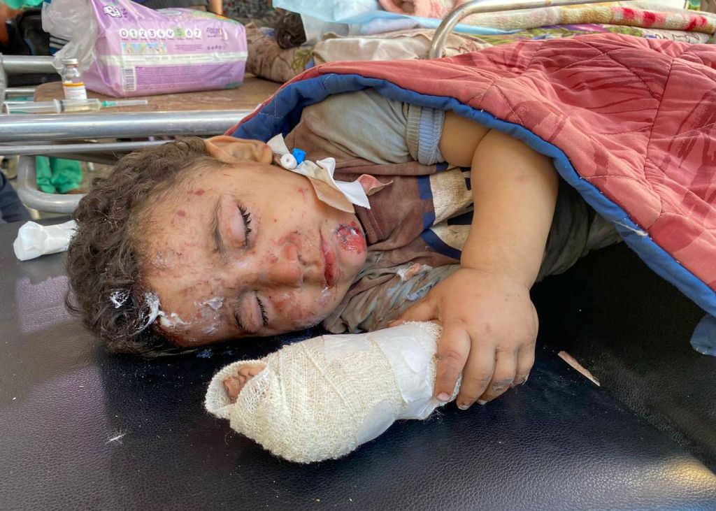 当地时间2023年11月15日,加沙地带,巴以冲突持续近40天,一名受伤的儿童在阿赫利阿拉伯医院外接受治疗,医院的一些部分被摧毁。