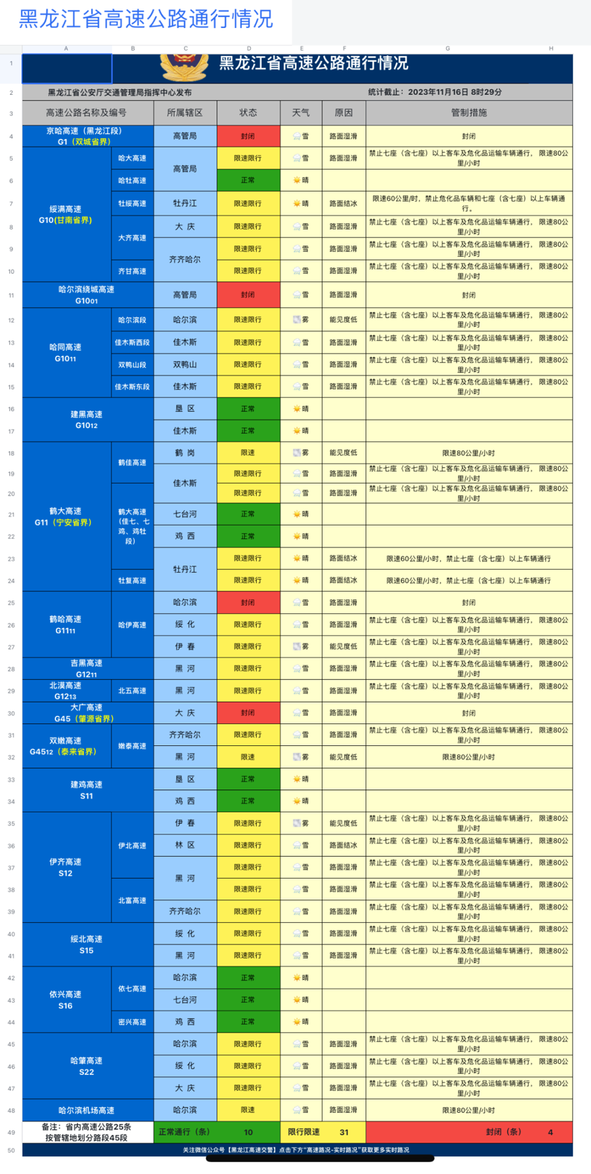 另据黑龙江省公安厅高速公路交通管理局消息,受新一轮降雪影响,目前京哈高速、哈尔滨绕城高速、鹤哈高速哈尔滨段等4条高速封闭,哈大、哈同等31条高速限速限行。