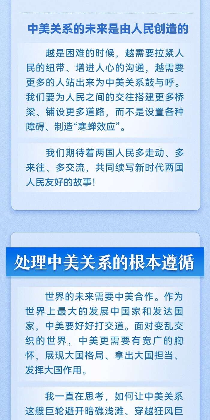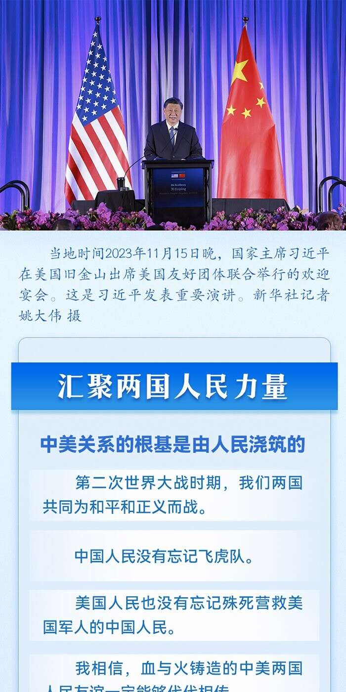 当地时间2023年11月15日晚,国家主席习近平在美国旧金山出席美国友好团体联合举行的欢迎宴会并发表重要演讲。习近平指出,任何一项伟大事业要成功都必须从人民中找到根基、从人民中集聚力量、由人民来共同完成。中美友好就是这样一项伟大事业。让我们汇聚起两国人民的力量,赓续中美友谊,推进中美关系,努力为促进世界和平和发展作出更大贡献!