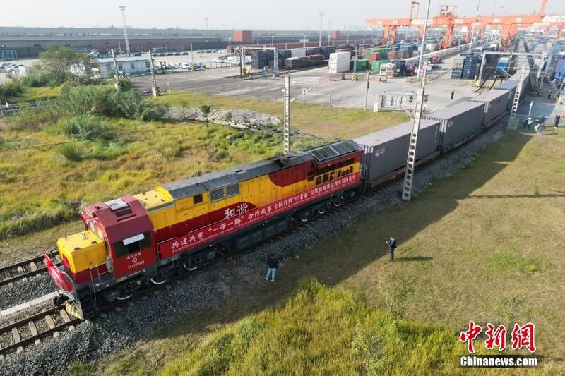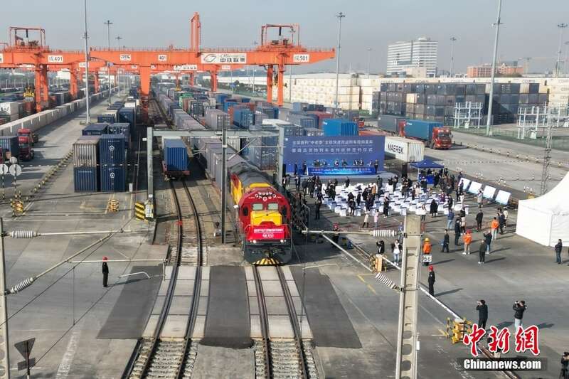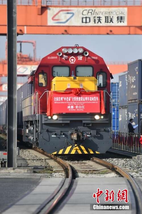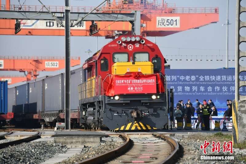 11月17日,首列“中老泰”全铁快速货运列车从位于四川省成都市青白江区的成都国际铁路港驶出开往泰国,一列满载泰国优质产品的回程班列也将奔往成都国际铁路港,这标志着成都至泰国全铁快速货运列车通道的双向畅通。图为首列“中老泰”全铁快速货运列车驶出成都国际铁路港。