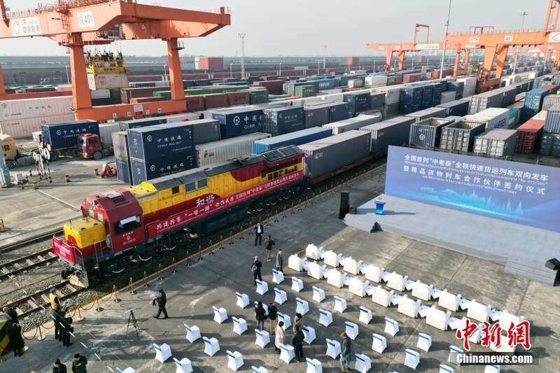 11月17日,首列“中老泰”全铁快速货运列车从位于四川省成都市青白江区的成都国际铁路港驶出开往泰国,一列满载泰国优质产品的回程班列也将奔往成都国际铁路港,这标志着成都至泰国全铁快速货运列车通道的双向畅通。图为首列“中老泰”全铁快速货运列车驶出成都国际铁路港。(无人机照片)