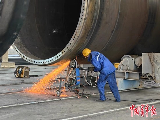 三一(塔城)风电设备有限公司的员工在焊接风电塔筒。中青报·中青网记者 王豪/摄