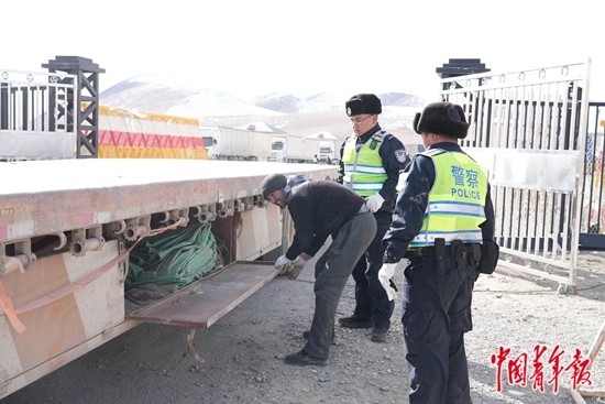 11月6日,慕士塔格峰山脚下的卡拉苏口岸前哨班,海拔4560米,卡拉苏出入境边防检查站民警正在检查入境车辆。中青报·中青网记者 王雪迎/摄