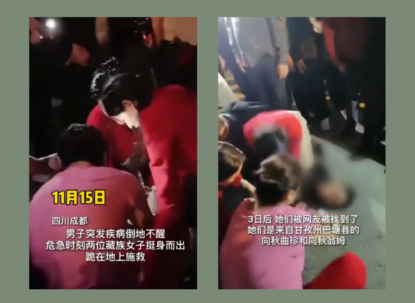 近日,成都市武侯区,一名中年男性突发疾病,倒地不醒,两位身著藏族服装的女子挺身而出,跪在地上实施紧急救助。经过紧急抢救,患者终于恢复了心跳,呼吸也回到微弱状态。当救护车赶到现场后,两女子才站起身来,悄然离开了现场。“她们就像突然出现的天使,她们真美!”现场施救的视频被围观群众拍下,并经网友大量转发,两名藏族姑娘的义举已获得网络高赞,大家纷纷通过社交软件寻找“最美的她们”。3日后,“在成都街头身着藏装跪地救人的女子”被找到了,她们是来自甘孜州巴塘县的向秋曲珍和向秋翁姆,是成都铁路卫生学校和南充卫生学校医护专业的在校学生,目前正在四川卫生康复职业学院(华西分院西藏成办医院)实习。“面对当时突发的状况,我们平时所学的医学知识和技能派上了用场,所以义无反顾地站了出来,抓住黄金时间救人。”她们说。