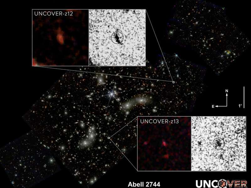 由宾夕法尼亚州立大学研究人员领导的国际研究小组对该区域的深场图像进行跟踪,确认了这些星系的距离,并通过詹姆斯·韦伯太空望远镜提供的新光谱数据对两个星系进行了性质判定。研究小组估计,詹姆斯·韦伯太空望远镜探测到的光是这两个星系在宇宙约3.3亿岁时发出的,经过大约134亿光年的旅行才被詹姆斯·韦伯望远镜捕捉。研究人员表示,由于宇宙在膨胀,这两个星系目前距离地球约330亿光年。