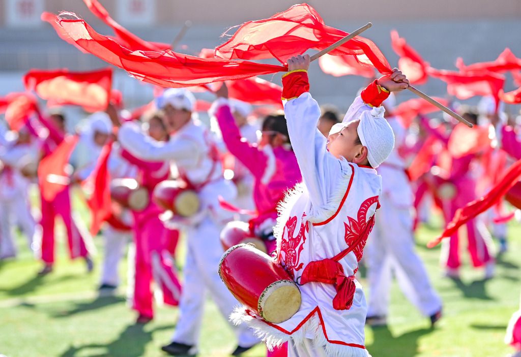 2023年11月16日,内蒙古鄂尔多斯,鄂托克前旗第二小学学生在大课间活动展演中表演安塞腰鼓。