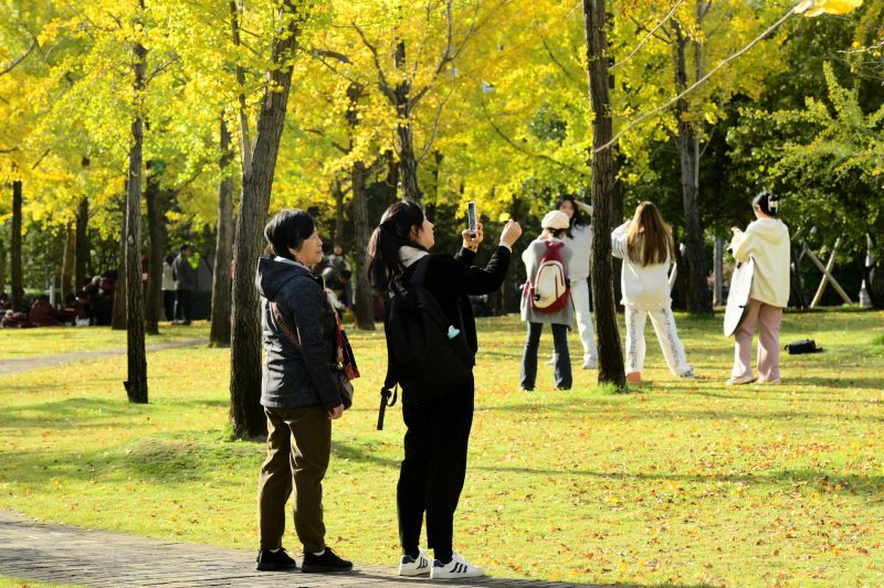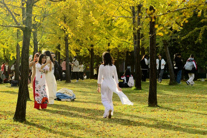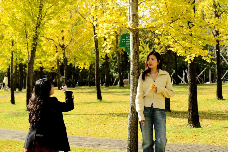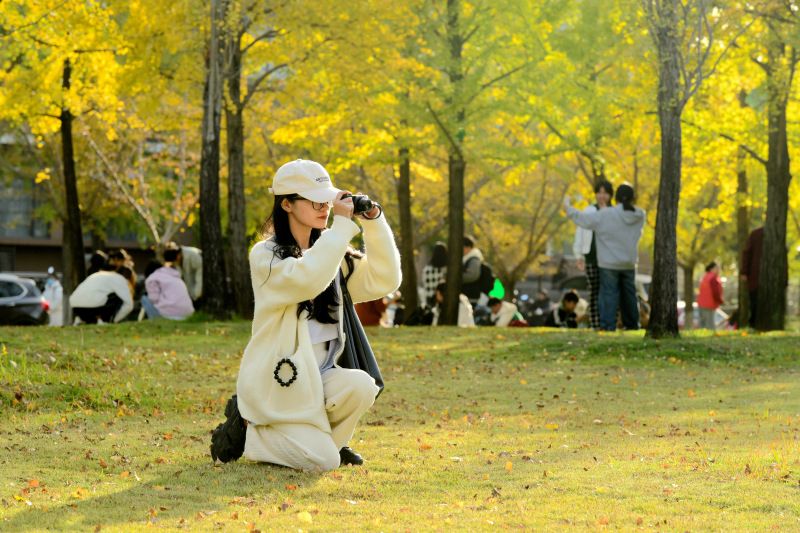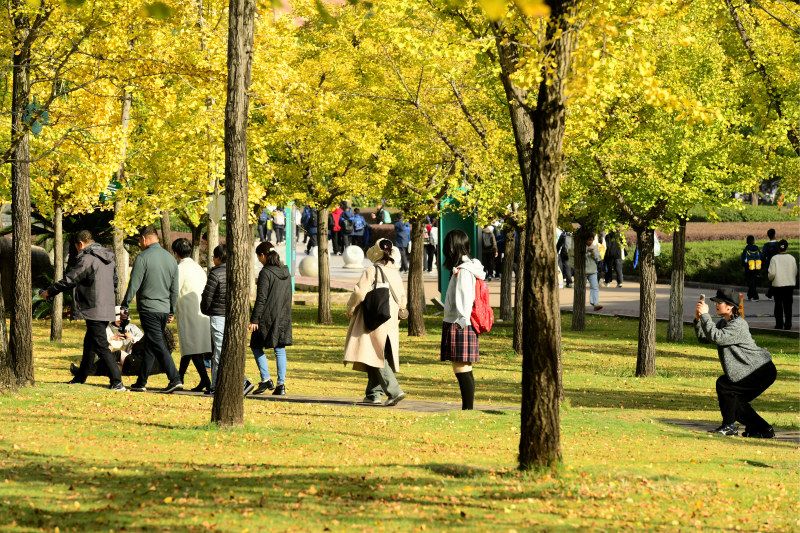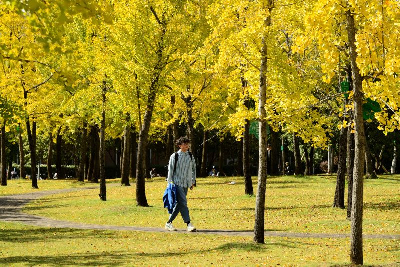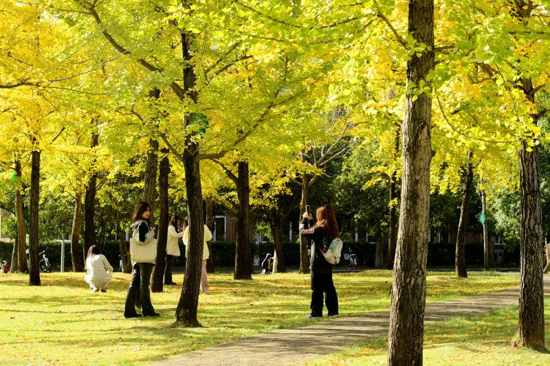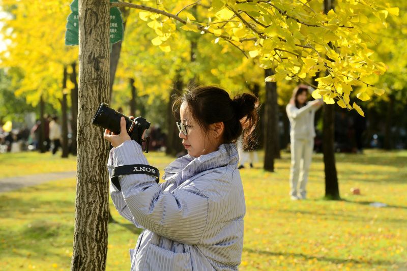 2023年11月17日,浙江金华,冬已至,秋依浓;银杏“换色”,校园“晒金”,浙江师范大学校园里银杏换色景色迷人,阳光穿透大片银杏叶,犹如洒落点点金光,呈现出一派色彩斑斓的醉美景象,吸引众多师生和游客纷纷前来打卡拍照,好不惬意。