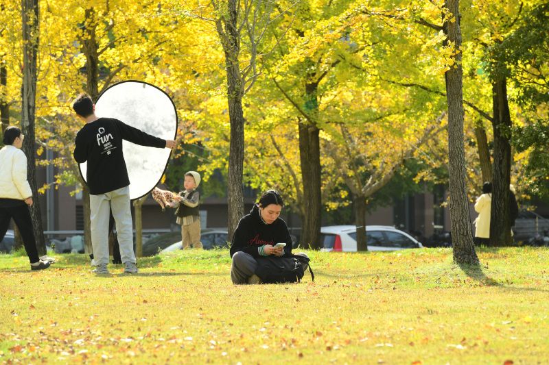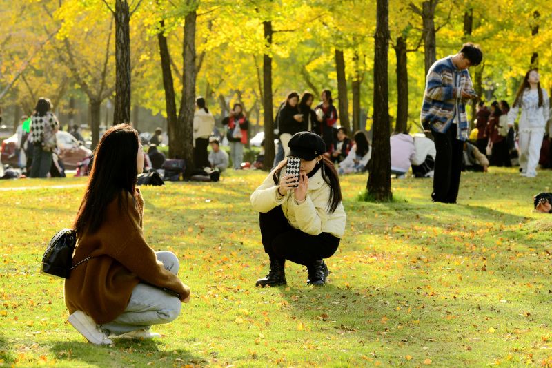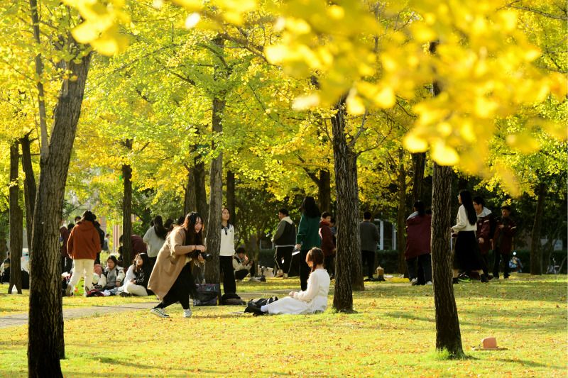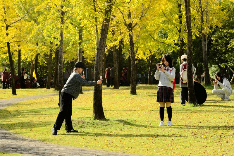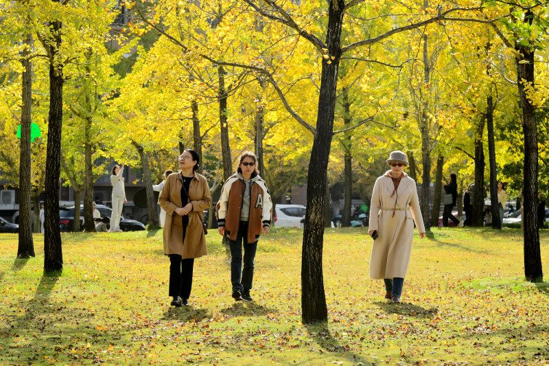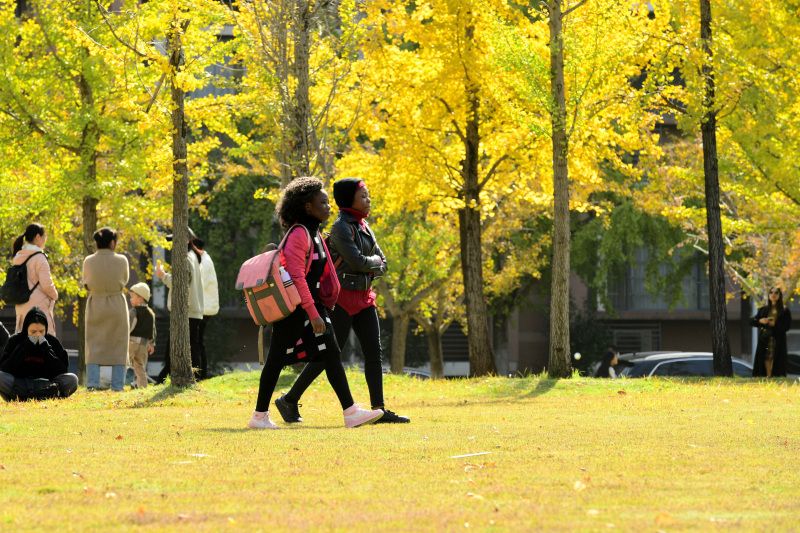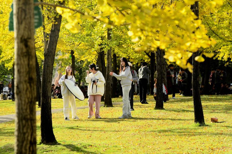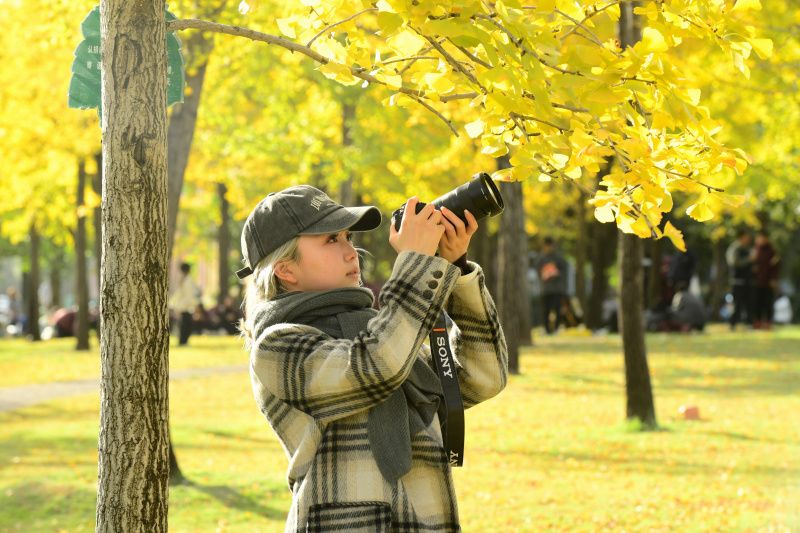 2023年11月17日,浙江金华,冬已至,秋依浓;银杏“换色”,校园“晒金”,浙江师范大学校园里银杏换色景色迷人,阳光穿透大片银杏叶,犹如洒落点点金光,呈现出一派色彩斑斓的醉美景象,吸引众多师生和游客纷纷前来打卡拍照,好不惬意。