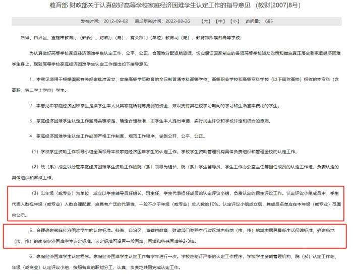 教育部和财政部发布的《关于认真做好高等学校家庭经济困难学生认定工作的指导意见》,对评定组织和家庭经济困难学生的认定标准等内容有所明确。