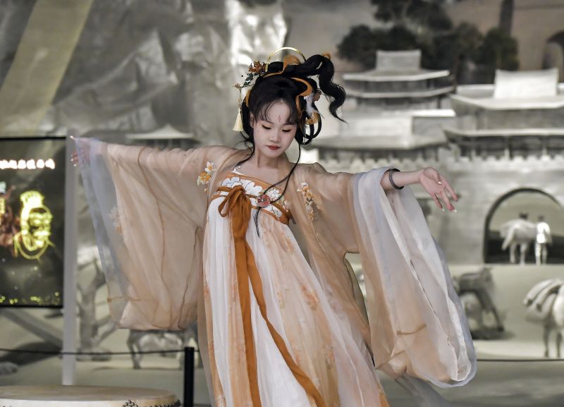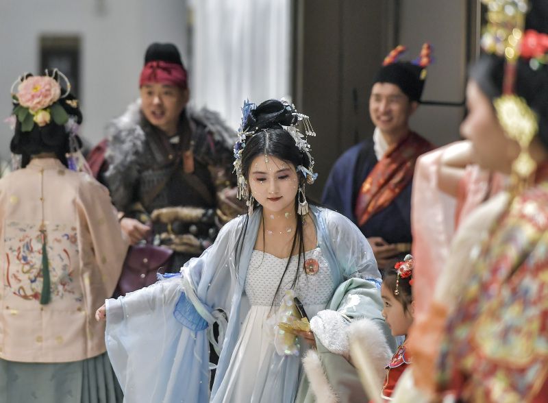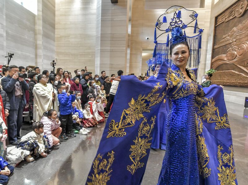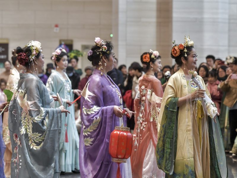 2023年11月18日,“汉服出行日”活动在乌鲁木齐市博物馆举行,多个汉服组织通过“国风走秀”展示传统服饰之美,也吸引众多市民身着汉服参与其中。 中新社记者 刘新 摄