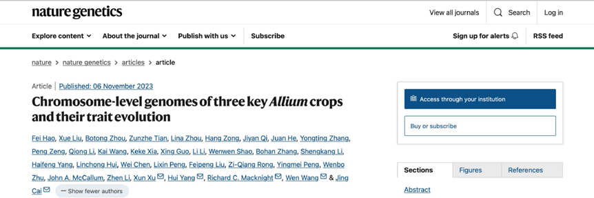 2023年11月6日,Nature Genetics期刊以“Chromosome-level genomes of three key Allium crops and their trait evolution”为题,发表了西北工业大学生态环境学院蔡晶和王文教授团队联合生命学院杨慧教授、新西兰奥塔哥大学生物化学系Richard Macknight教授和华大农业基因组国家重点实验室徐讯教授关于葱属植物生物多样性起源进化机制的研究成果。