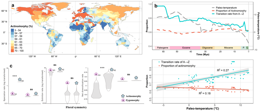 该成果针对以往关于被子植物花对称性研究中多基于生物学角度和种群水平探讨的不足,从宏观尺度上收集超过279,877个被子植物物种的花对称性数据,通过回归分析及祖先状态重建揭示了全球尺度被子植物花对称性组成的生物地理格局和历史动态趋势及其对(过去)气候的响应,证实了花对称性对气候变化的高度敏感性。该成果突破了传统研究强调植物生长性状而忽略有性繁殖性状(即花部特征)对气候变化的关键响应,并更新了两侧对称花对促进被子植物分化的认知,对预测未来气候变化情境下的全球植物多样性及植被结构动态具有重要意义。