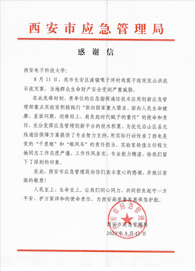 2023年8月11日,西安市长安区滦镇喂子坪村鸡窝子组突发山洪泥石流灾害 ,程文驰与团队所在的学校应急指挥通信技术应用创新应急管理部重点实验室利用应急管理创新平台的技术积累,为优化沿山区县无线通信保障方案提供了专业智力支持。 在此之前,诸如郑州“7·20”特大暴雨灾害、长沙“4·29”自建房坍塌和重庆森林火灾等重特大灾害事故中,程文驰与团队依托应急管理部,多次在技术与装备方面支撑救援演练与实战救援。