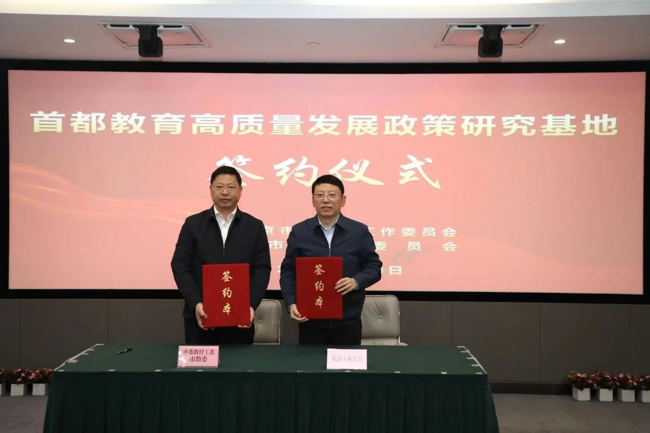 为深入贯彻落实党的二十大精神,实施科教兴国战略,充分发挥高校教育学科专业优势,服务支撑首都教育高质量发展,10月23日,北京市教育两委与包括北京大学、清华大学、北京工业大学和首都师范大学等在内的8所首都高校签订建立首都教育高质量发展政策研究基地合作协议;同时,成立首都教育高质量发展政策咨询委员会,来自全国各地的43位教育领域专家学者作为“智囊团”成员,将为解决首都教育难题建言献策,服务支撑首都教育高质量发展。北京工业大学党委书记姜泽廷代表学校签约。