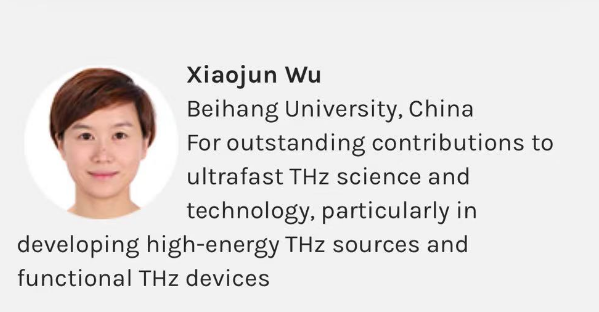 吴晓君,北京航空航天大学教授、博导,长期从事太赫兹强源、器件、系统技术等研究;以第一或通讯作者发表Nature Photonics、Nature Communications、Advanced Materials等SCI论文60余篇,授权专利20余项,主持国家级项目十余项;获得国家青年人才计划、德国洪堡学者、美国光学学会会士、国际红外毫米波太赫兹学会首个女科学家奖、第一届超快科学全球女科学家奖、第一届中国科技青年论坛一等奖和总论坛科技新星奖、国际超快现象与太赫兹首届X-C Zhang奖等荣誉和奖励;现担任《Optics Express》、《Electromagnetic Science》期刊编委,以及《中国激光》、《物理学报》、《量子电子学报》等期刊专题客座主编,担任领域内数十个国际国内学术会议分会主席和程序委员会成员,在领域内重要学术会议做特邀报告40余次。