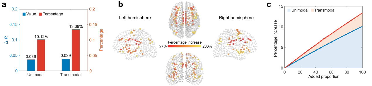 进一步,通过LASSO回归比较只有低频特征模和加入高频特征模后的结构-功能耦合强度的变化,发现随着高频特征模的加入,结构-功能耦合强度稳定持续增加,其中增长百分比最大的区域主要集中在下顶叶、岛叶、扣带回和前额叶,表明高频特征模对大脑(尤其是跨模态联合皮层)的结构-功能耦合关系的促进作用(图3)。