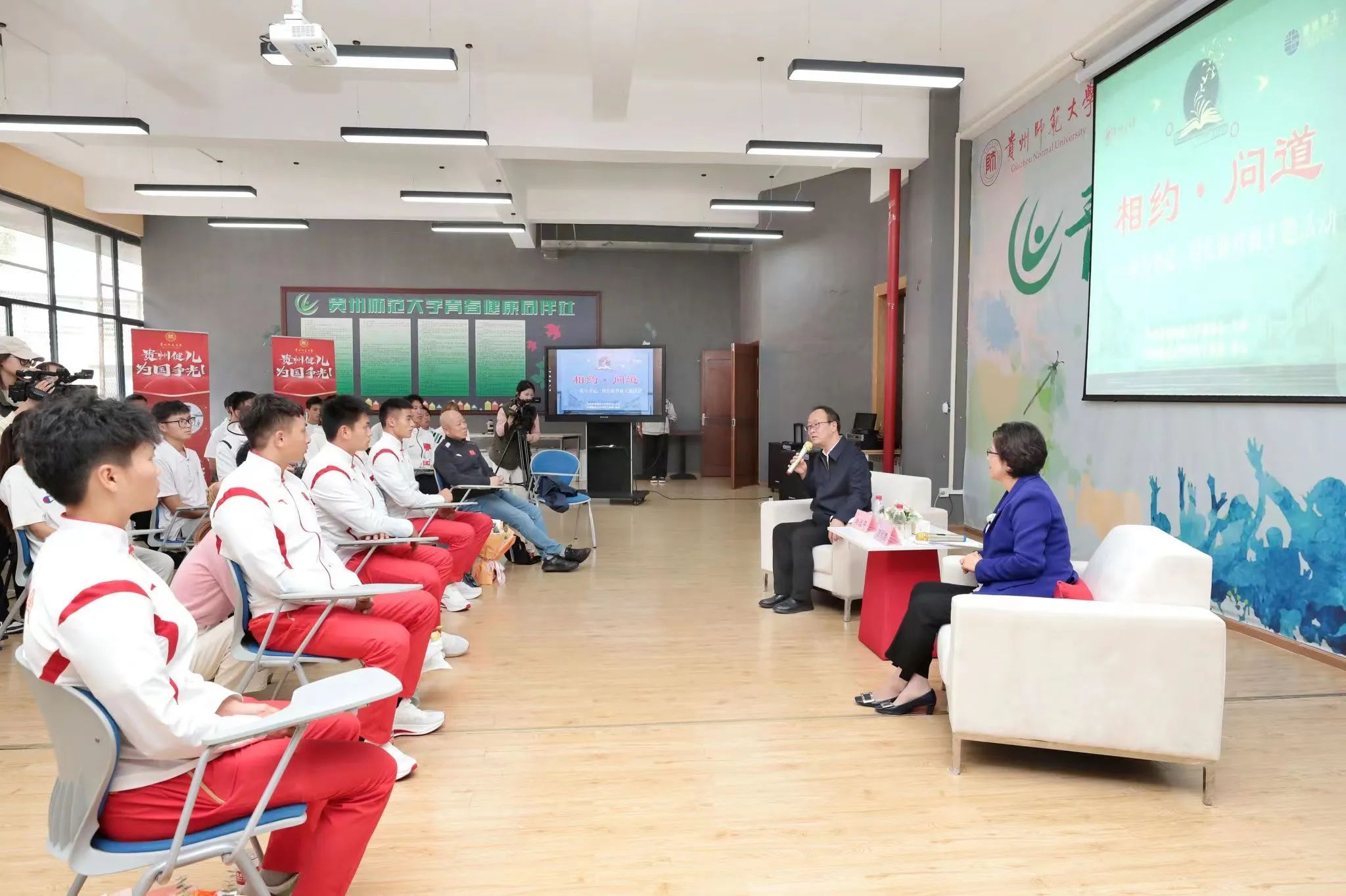 10月24日下午,学校在学生事务中心举行“相约·问道——我与书记、校长面对面”主题活动。校党委书记肖远平与学生亲切交流。校党委副书记银熙惠主持。活动邀请了贵州省水上运动发展中心主任、总教练王宇,亚运会皮划艇静水女子200米双人划艇金牌获得者体育学院2020级学生帅常文,亚运会龙舟男子200米竞速赛、500米直道竞速赛金牌获得者、男子 1000米直道竞速赛银牌获得者体育学院2018级学生王亮、2020级学生杨海雷、2022级学生冯朝朝参加。学校相关单位负责人及各学院的学生代表参加。