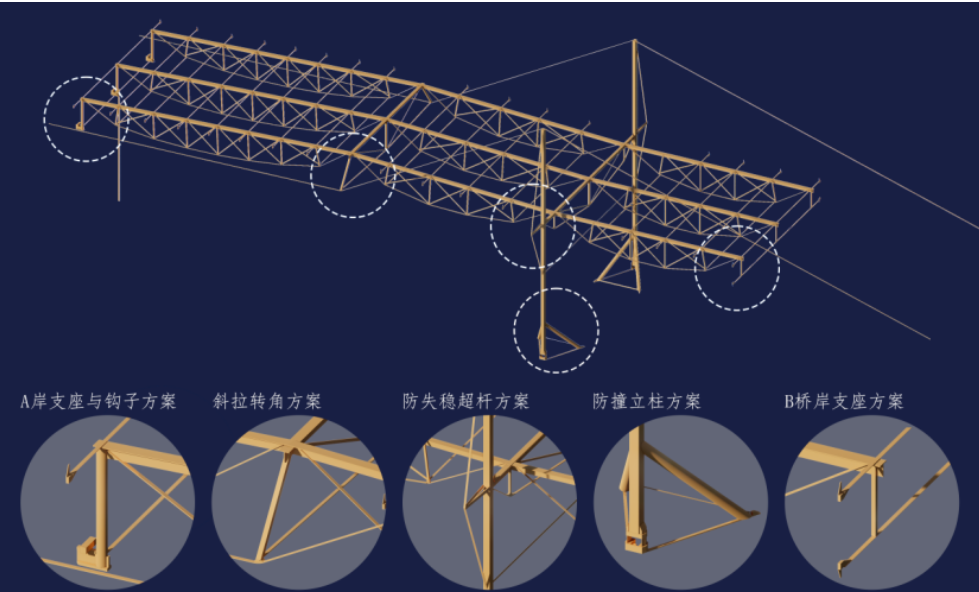 3、巧妙利用桥面板的横向刚度,通过钩子和拉索为桁架上弦提供横向约束,提升桁架上弦的横向抗失稳能力。