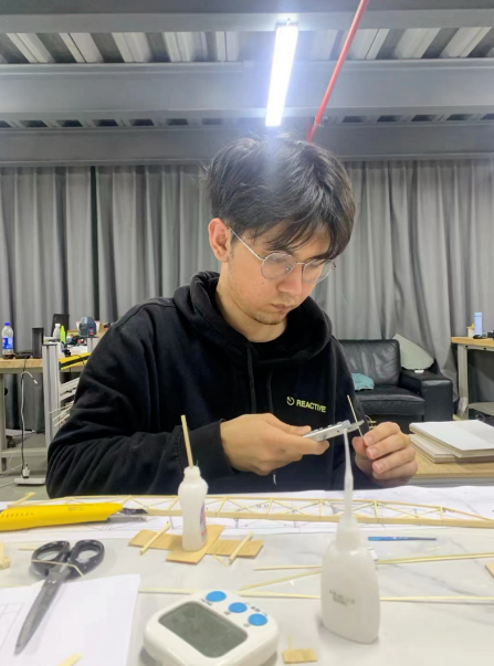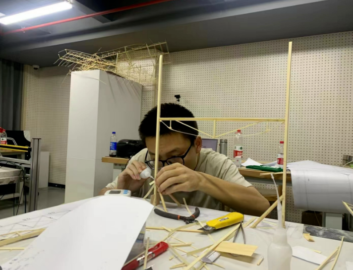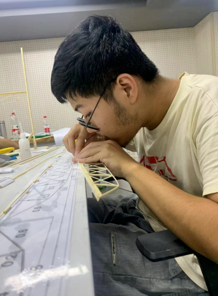 “我是徐明宋,来自设计学院建筑学系,目前大三。回顾这四个多月的备赛经历,有太多的辛苦,但更多的是收获。说实话,一开始参加这个比赛,除了对结构设计与模型制作有那么一点兴趣以外,更多的是本着给在大学里散漫惯了的自己找一点事做的想法,只是没想到最后是亿点事罢了。一开始的训练可以说是诸事不顺,制作时间、模型质量、细节处理,没有哪个地方能做到让人满意的。甚至作为队长的我还体验了几把由于睡过头而被队员跑到寝室叫醒的特殊服务。实在是不该啊。不过这所有的一切,都在我们日复一日的模型制作中,相互讨论、相互监督中,金牌教练宋老师的高超指导下,以及队长向队员们许诺的不知道第几顿请客补偿之后,开始一步步向着更好逼近。到了最后的比赛时,我想我们整个队伍都是焕然一新的。起码早睡早起这件事还是被我拿捏得死死的。身为建筑生,我想我的模型制作水平也同样得到了升华。无论过程如何曲折,这个4个月以来所有的经历,我想我回忆它们时都将是带着笑容的。而这次比赛最后的成果,也终于为我们这4个月以来的努力画上了一个最圆满的句号。”