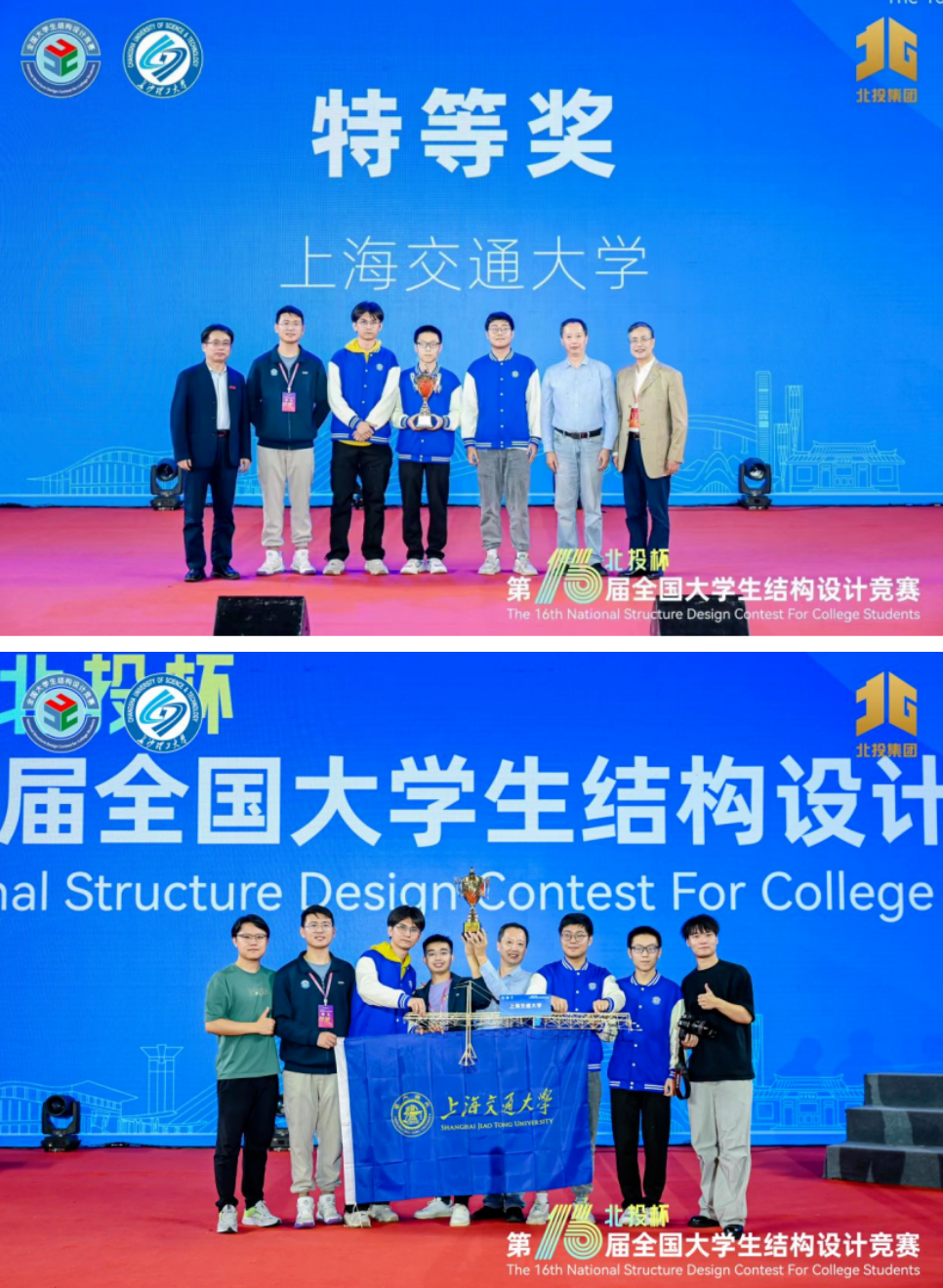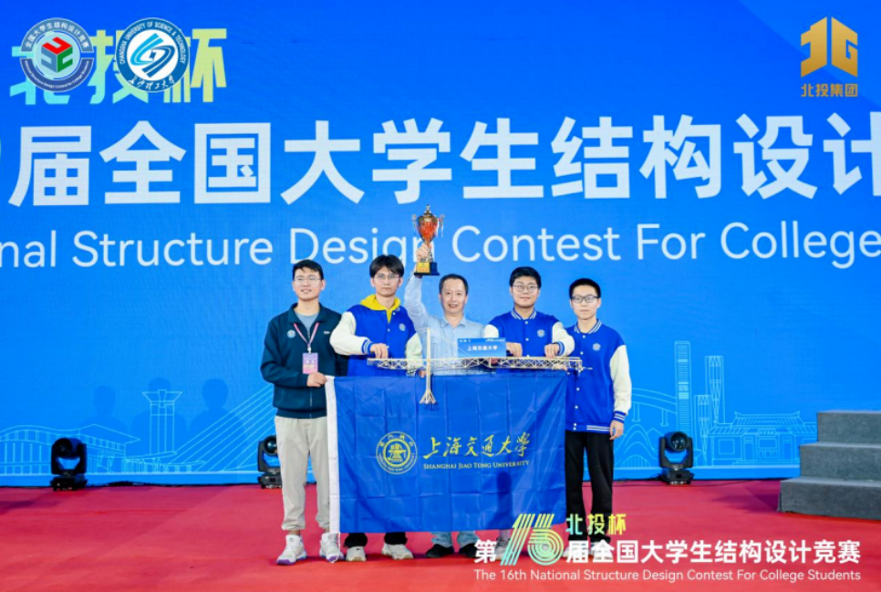 10月29日, “北投杯”第十六届全国大学生结构设计竞赛 在长沙理工大学闭幕。由上海交大船建学院宋晓冰、陈思佳指导,土木工程专业2021级本科生热地力·玉山、陈恒恒,建筑学专业2021级本科生徐明宋组成的上海交通大学代表队从参与本届赛事的全国共581所高校、1463支参赛队中脱颖而出, 摘得全国冠军佳绩,荣获比赛特等奖。 此前,上海交通大学在之前的十五届比赛中荣获一次特等奖,十三次一等奖,这一历史性赛绩,在全国土木工程专业高校中遥遥领先。