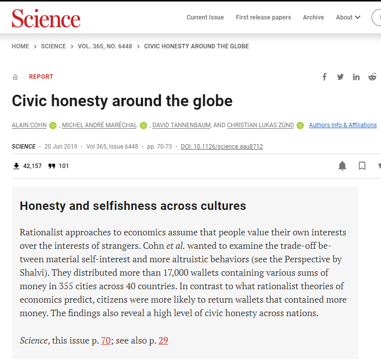 《科学》发表了一篇题为《全球公民诚信度》的研究,中国在40个国家中排名最末。而衡量诚信的标准,只有捡到钱包后是否用电子邮件联系失主这一条。这一结论引得反对质疑声四起。