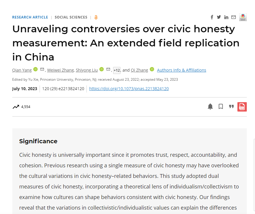 2023年7月,这项历经4年的研究正式发表于《美国科学院院报》。研究显示,虽然在中国丢失钱包的“电子邮件回复率”是27.4%,但“钱包回收率”却达77.8%,而集体主义文化对此有重要影响。