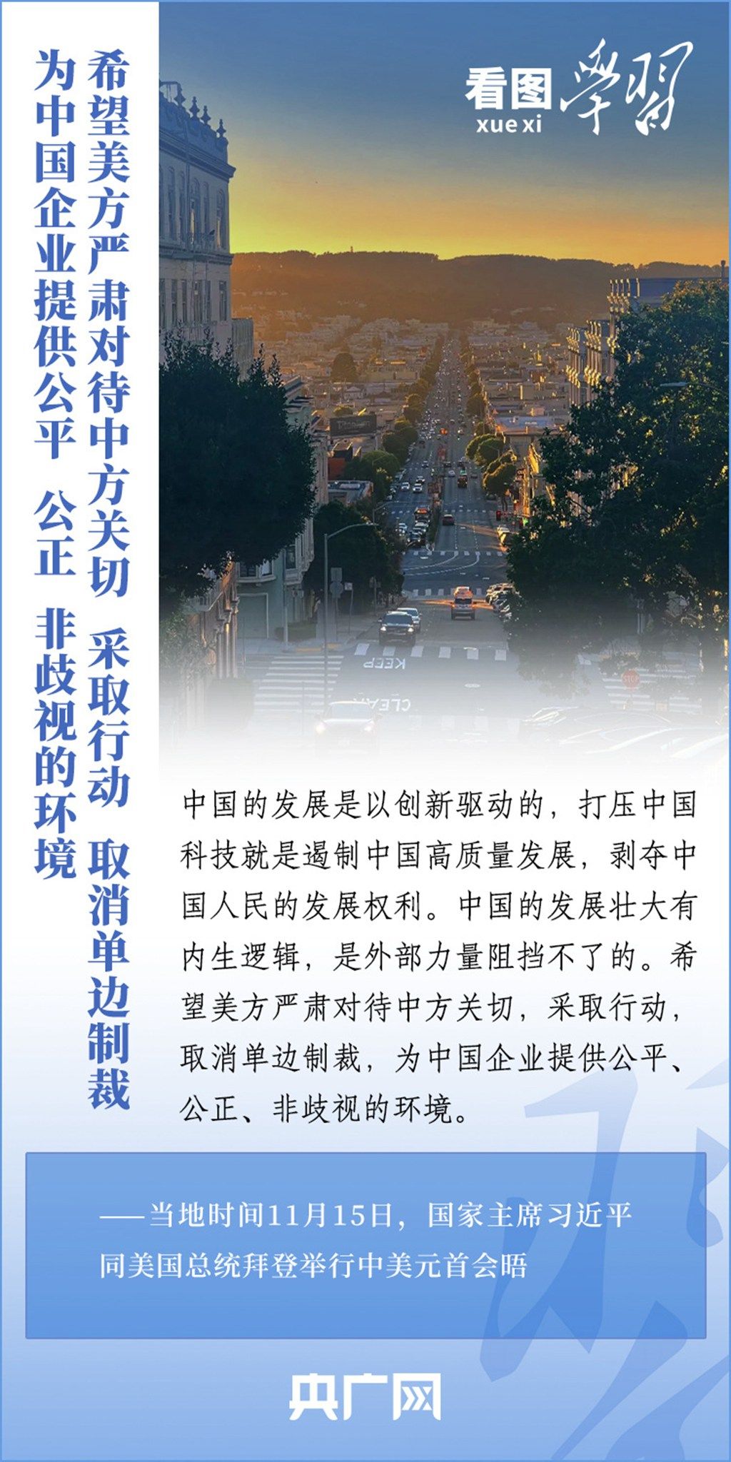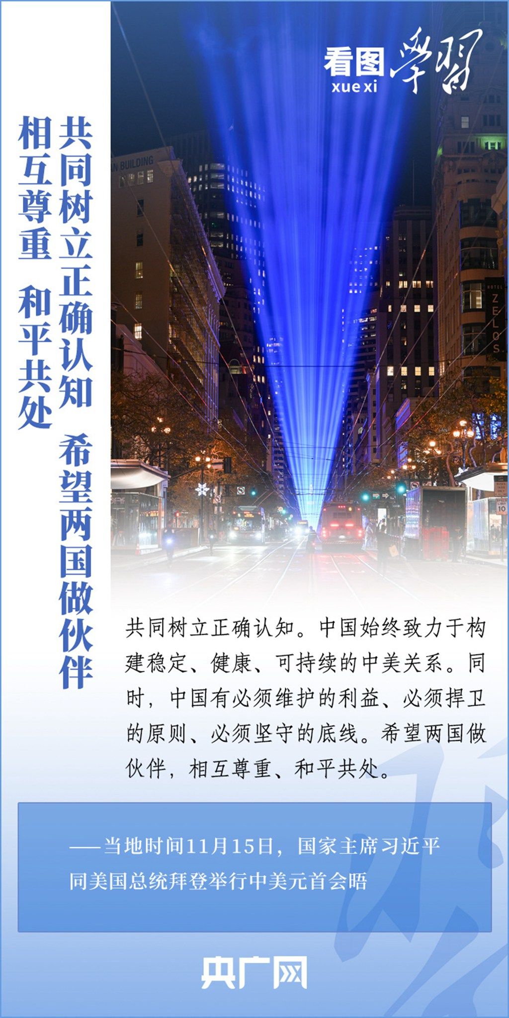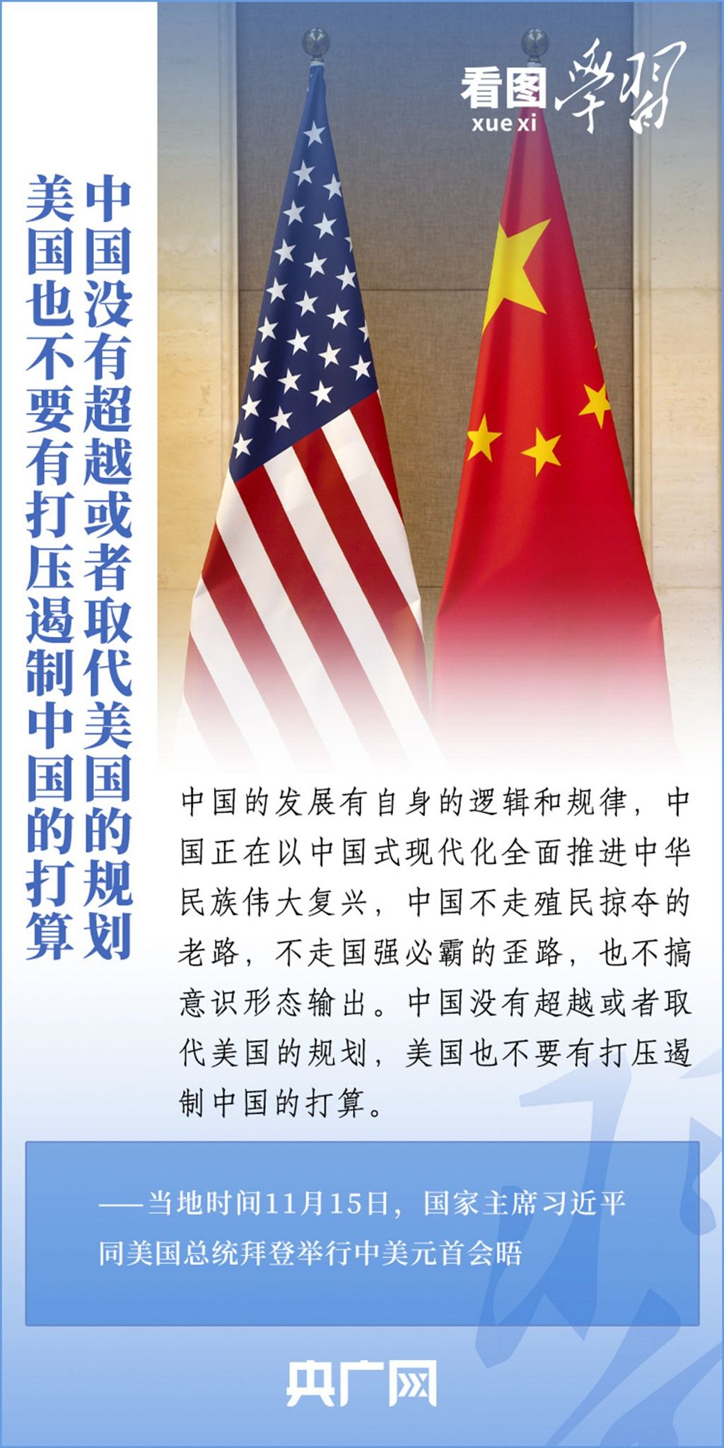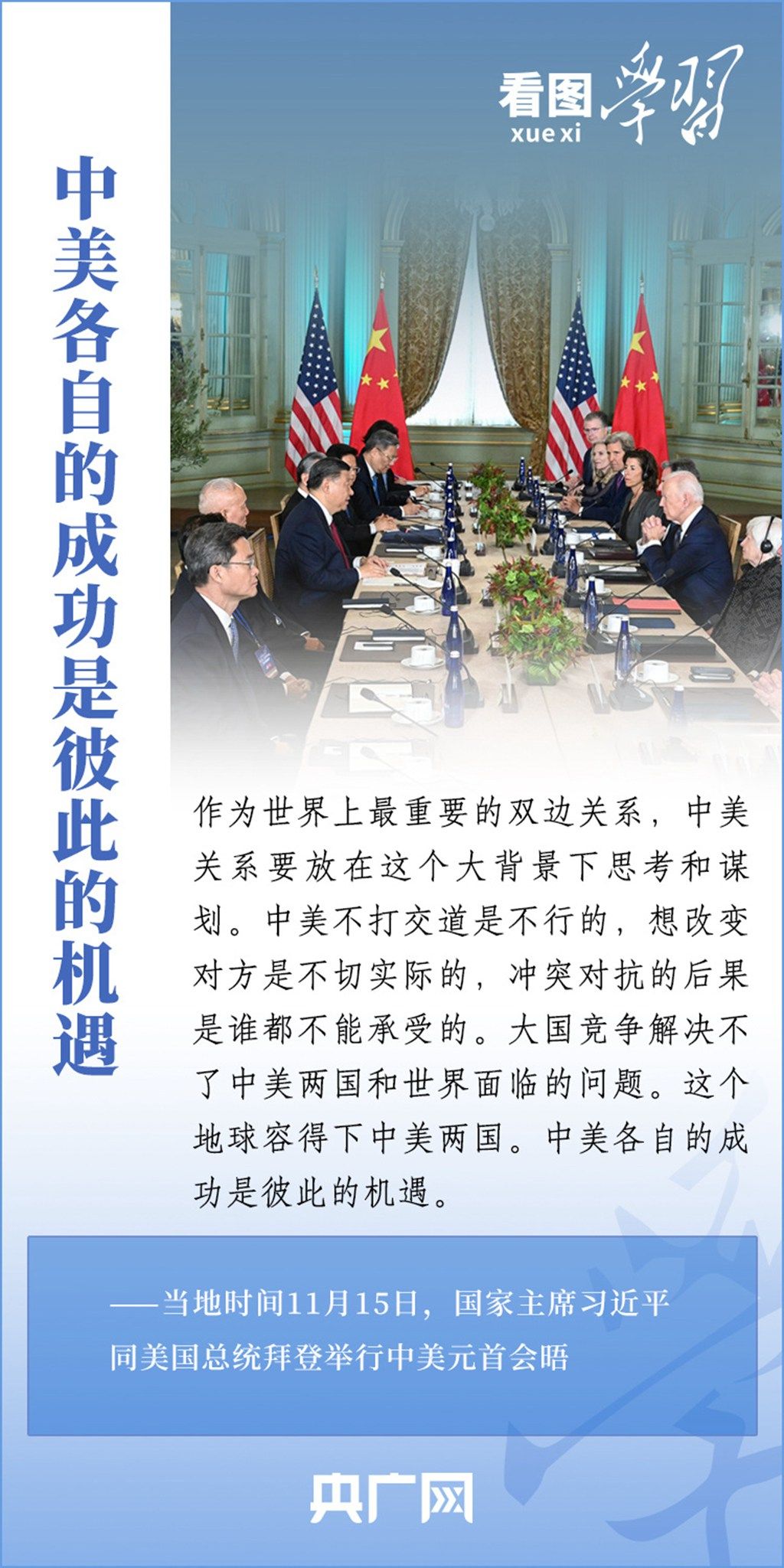 当地时间11月15日,国家主席习近平在美国旧金山斐洛里庄园同美国总统拜登举行中美元首会晤。两国元首就事关中美关系的战略性、全局性、方向性问题以及事关世界和平和发展的重大问题坦诚深入地交换了意见。习近平主席指出,大国竞争解决不了中美两国和世界面临的问题。这个地球容得下中美两国。中美各自的成功是彼此的机遇。一起来学习!