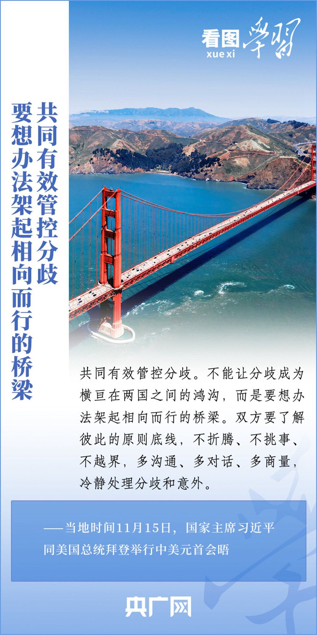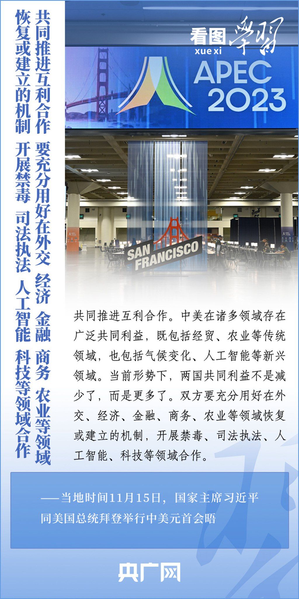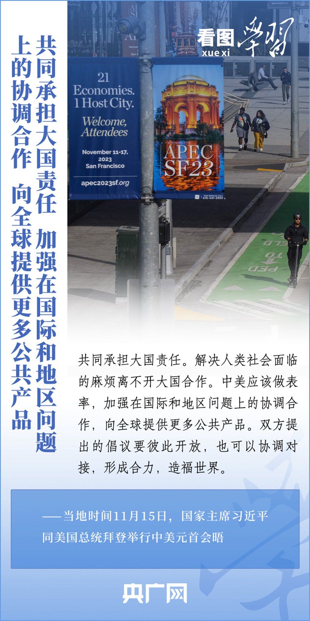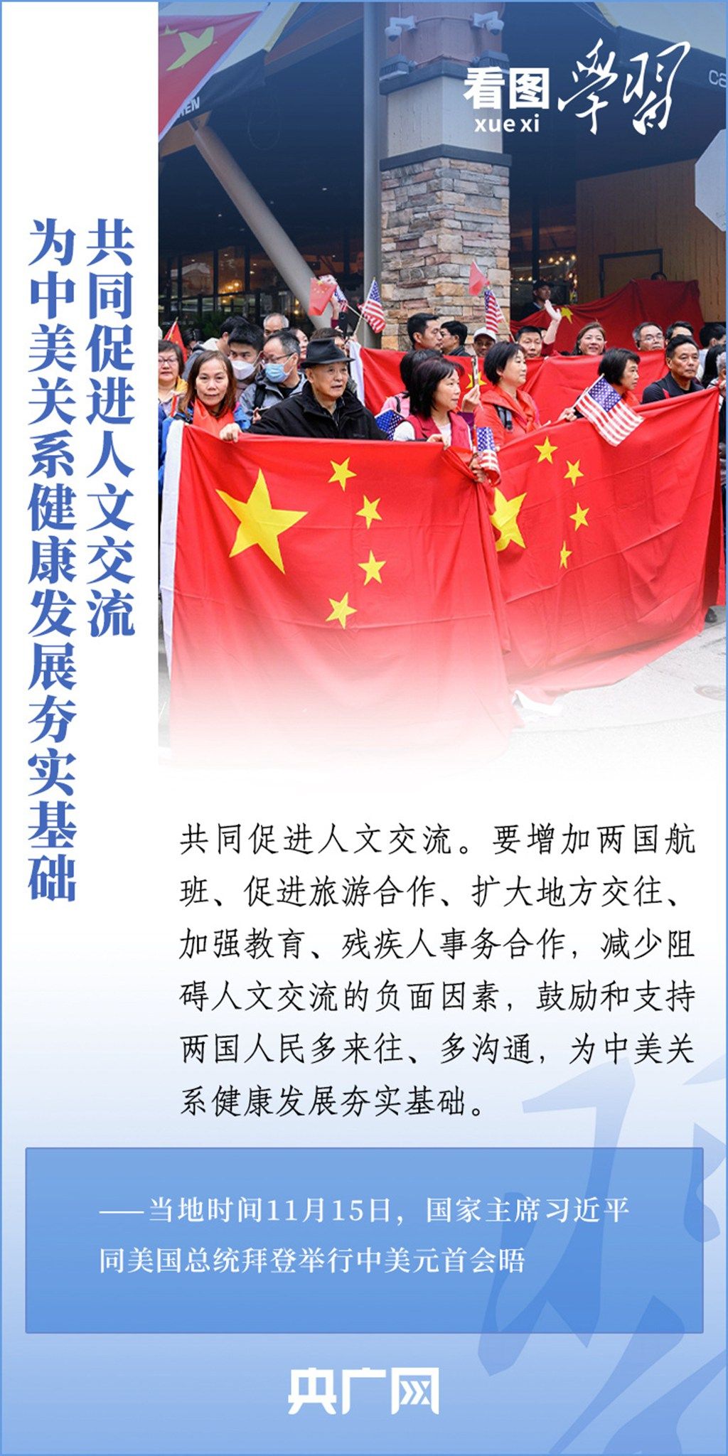 当地时间11月15日,国家主席习近平在美国旧金山斐洛里庄园同美国总统拜登举行中美元首会晤。两国元首就事关中美关系的战略性、全局性、方向性问题以及事关世界和平和发展的重大问题坦诚深入地交换了意见。习近平主席指出,大国竞争解决不了中美两国和世界面临的问题。这个地球容得下中美两国。中美各自的成功是彼此的机遇。一起来学习!