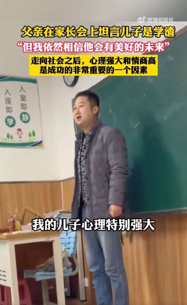 他毫不掩饰自己儿子在学习方面表现不佳:我的儿子学习成绩特别差,给我们班里严重拖了后腿,我也深表歉意,但是我依然相信他能够有个美好的未来。