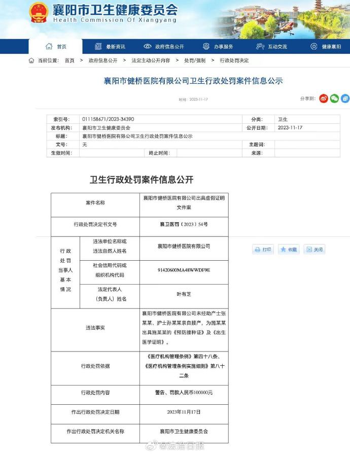 11月17日,襄阳市卫健委在官网公布了“襄阳市健桥医院有限公司卫生行政处罚案件信息公示”。