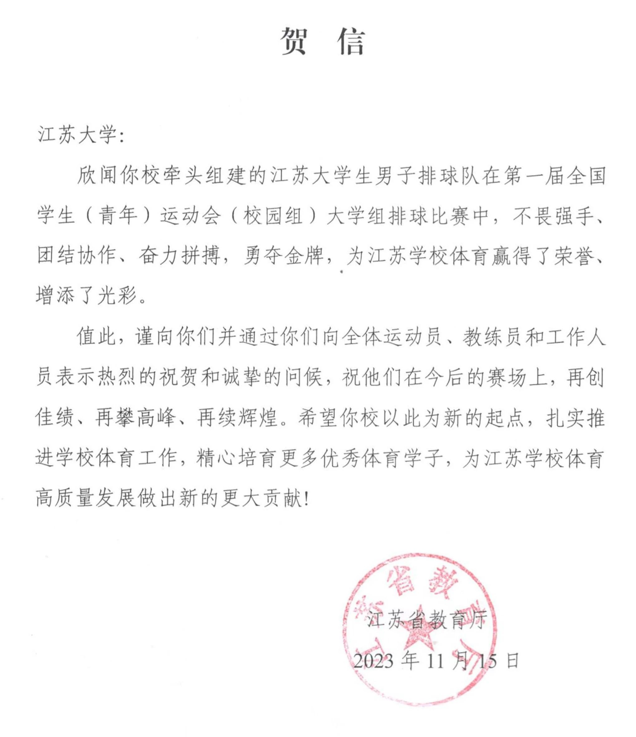 夺冠后,江苏省教育厅专门向我校发来贺信,向全体运动员、教练员和工作人员表示热烈祝贺和诚挚问候,并希望学校以此为新起点,扎实推进学校体育工作,精心培育更多优秀体育学子,为江苏学校体育高质量发展作出新的更大贡献。