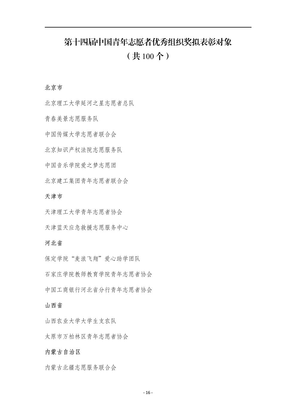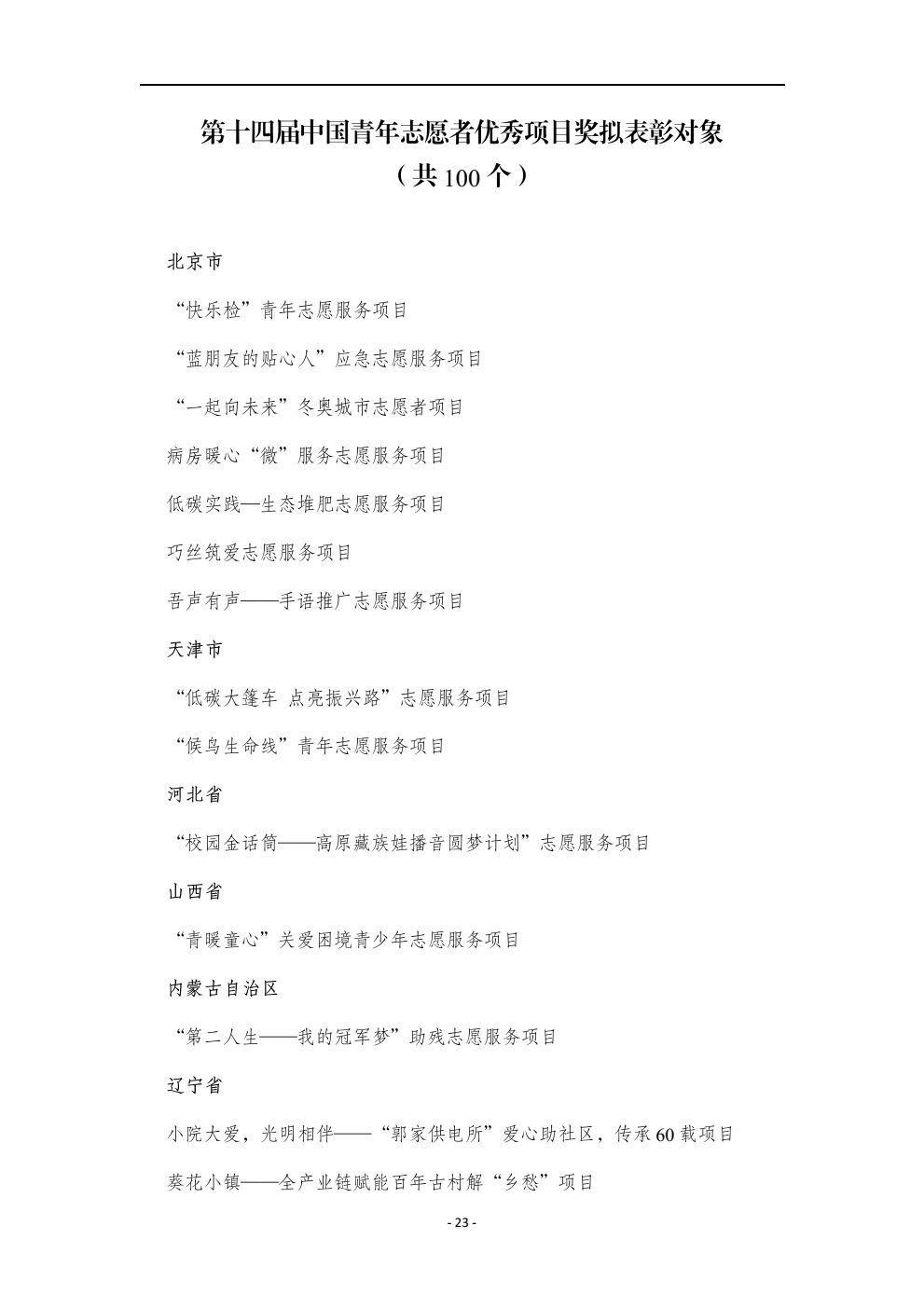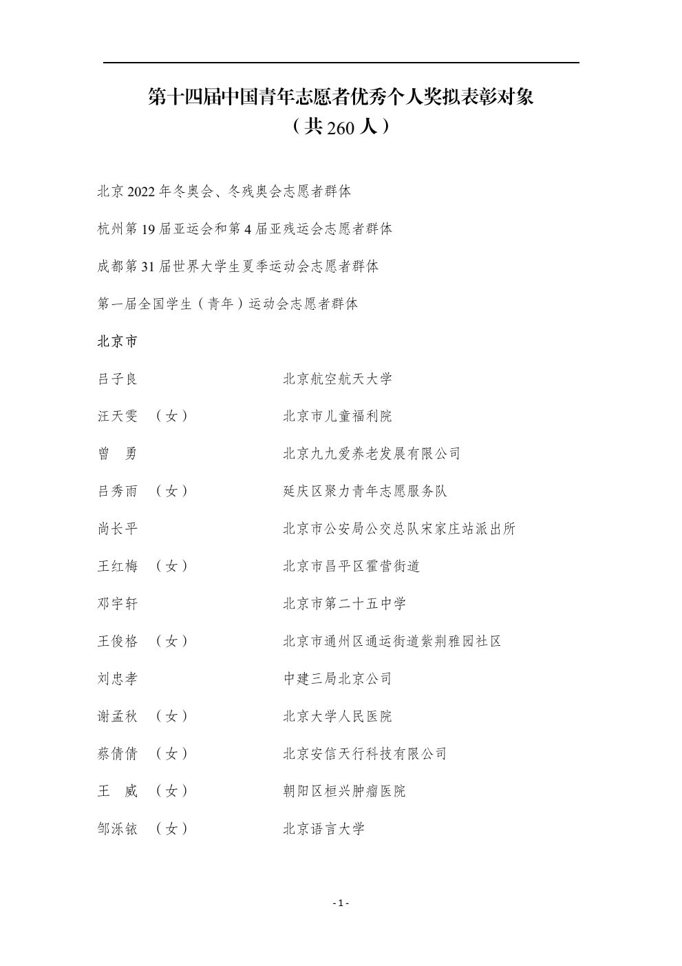 为深入学习贯彻党的二十大精神和习近平总书记在同团中央新一届领导班子集体谈话时的重要讲话精神,充分发挥先进典型示范引领作用,加强对广大青年的政治引领,激励和引导广大青年志愿者大力弘扬志愿精神,为强国建设、民族复兴伟业而奋斗,根据《共青团中央评比表彰管理办法》,共青团中央、中国青年志愿者协会决定表彰第十四届中国青年志愿者优秀个人奖、组织奖、项目奖获得者。根据评选表彰工作安排,在充分酝酿、集体研究的基础上,经综合评审、统筹考虑,确定北京2022年冬奥会、冬残奥会志愿者群体等260名个人为第十四届中国青年志愿者优秀个人奖拟表彰对象、浙江大学马兰红色志愿服务团等100个组织为第十四届中国青年志愿者优秀组织奖拟表彰对象、扎根计划——“三走四帮五联动”赋能乡村振兴志愿服务项目等100个项目为第十四届中国青年志愿者优秀项目奖拟表彰对象。