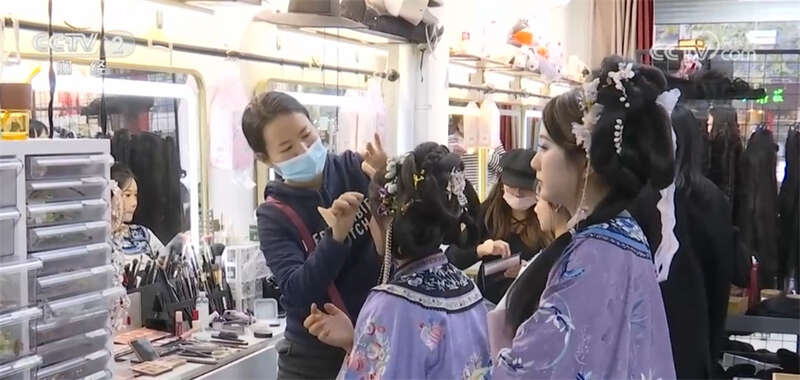 这股国潮风也带动了南京汉服的租赁、妆造等周边产业,离老门东很近的剪子巷,500米左右的巷子就有20家左右的汉服租赁店。