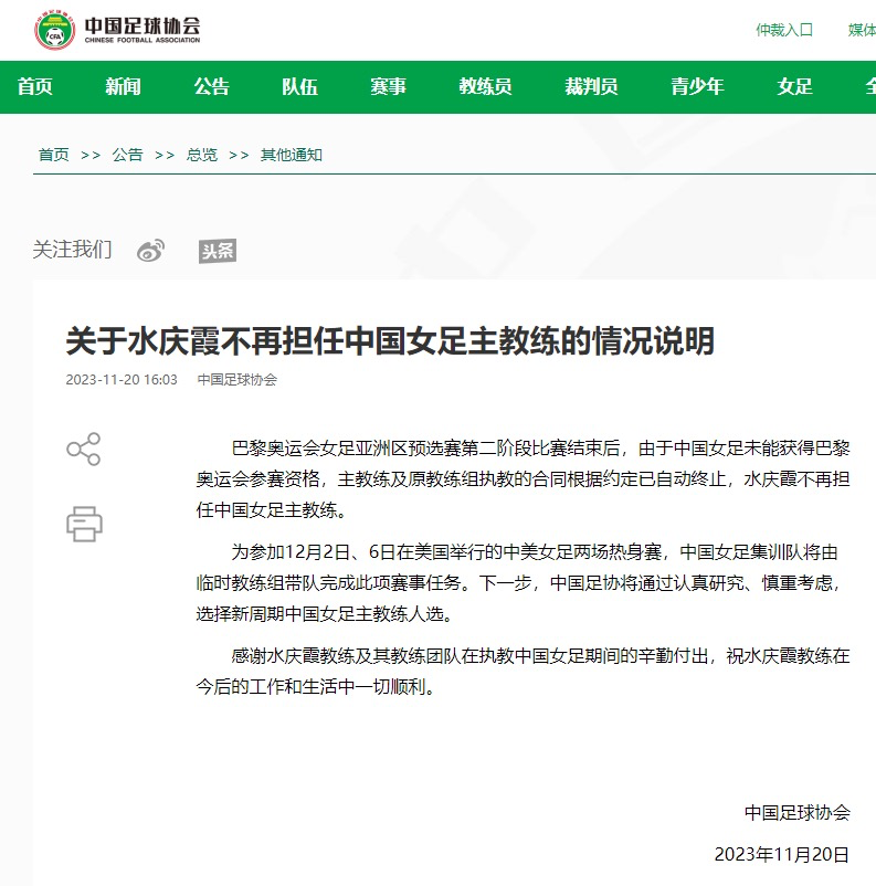 11月20日,中国足球协会官网发布《关于水庆霞不再担任中国女足主教练的情况说明》,全文如下: