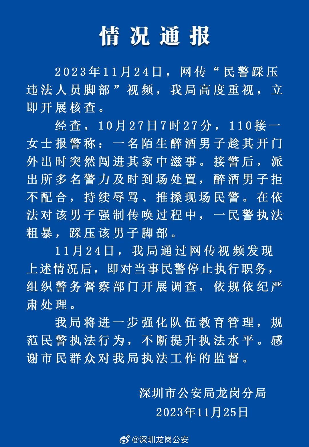 网传“民警踩压违法人员脚部”,深圳市公安局龙岗分局发布情况通报。