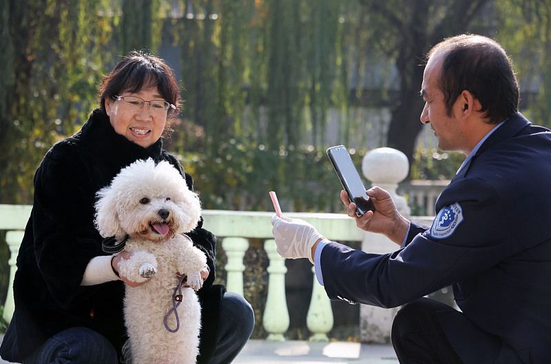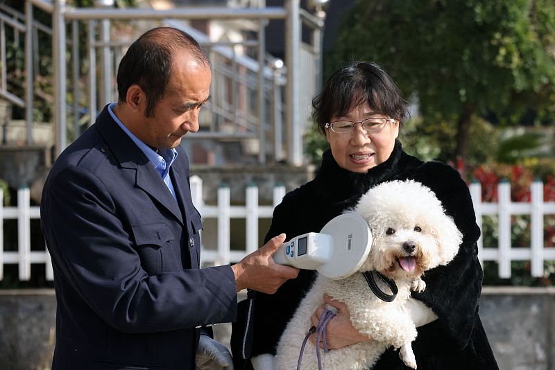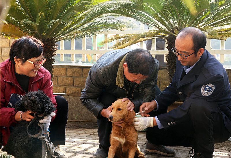 2023年11月27日,浙江湖州,德清县乾元镇恒星村,防疫员给犬只免费接种狂犬疫苗。