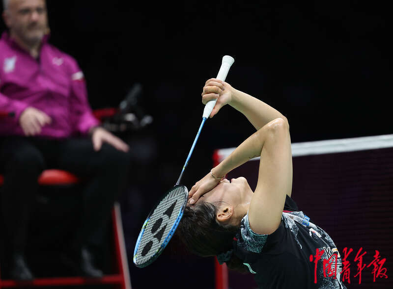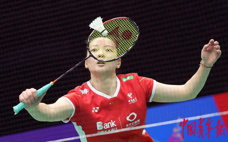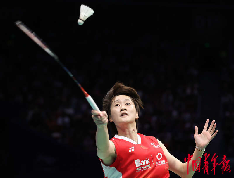 11月26日,广东深圳,深圳湾体育中心,2023李宁·中国羽毛球大师赛女单决赛,陈雨菲在比赛中。女单决赛在两名中国选手陈雨菲和韩悦之间进行,以21比18先胜一局的韩悦在第二局小腿肌肉拉伤,以4比21输掉了第二局。随后,韩悦向裁判示意无法坚持比赛。最终陈雨菲获得冠军、韩悦摘银。刘占崑/摄
