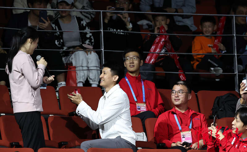 11月26日,广东深圳,深圳湾体育中心,2023李宁·中国羽毛球大师赛现场,羽毛球前国家队队员薛松(左二)在看台上向未婚妻求婚,赢得全场掌声。刘占崑/摄