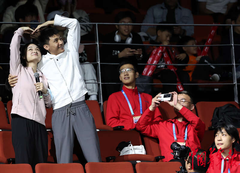11月26日,广东深圳,深圳湾体育中心,2023李宁·中国羽毛球大师赛现场,羽毛球前国家队队员薛松(左二)在看台上向未婚妻求婚,赢得全场掌声,随后他们向观众“比心”。刘占崑/摄
