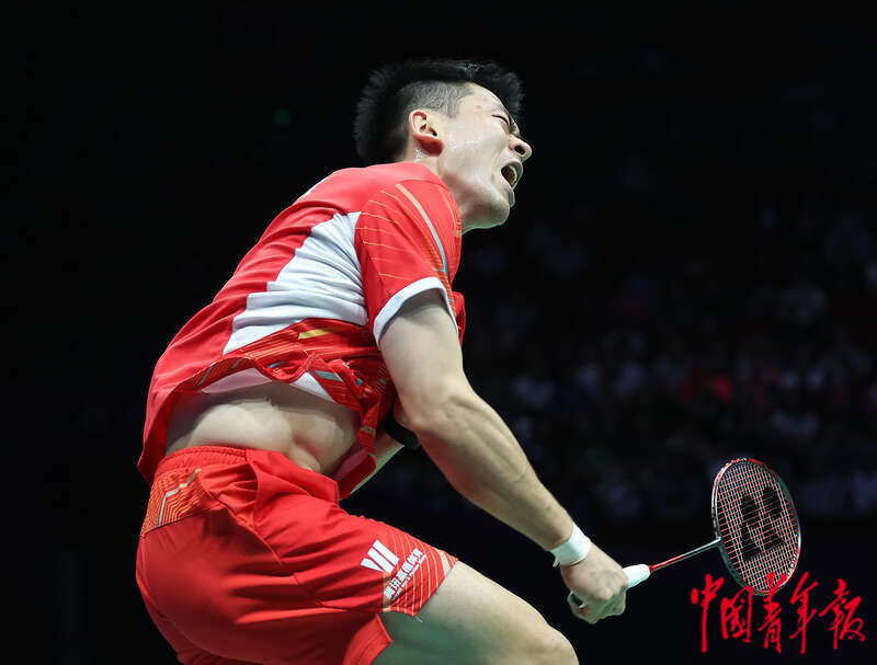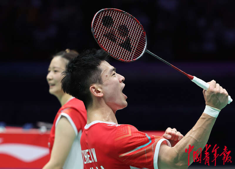 11月26日,广东深圳,深圳湾体育中心,2023李宁·中国羽毛球大师赛混双决赛,中国混双选手郑思维在比赛中扣球得分后呐喊。刘占崑/摄