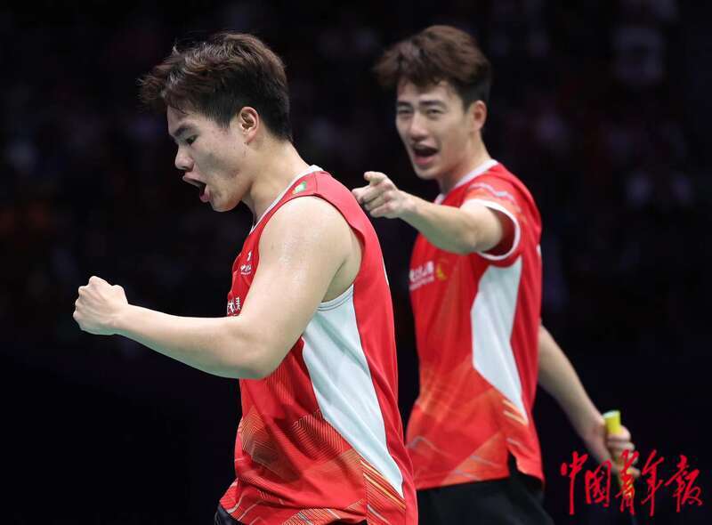 11月26日,广东深圳,深圳湾体育中心,2023李宁·中国羽毛球大师赛男子双打决赛中,中国组合梁伟铿(前)/王昶庆祝得分。刘占崑/摄