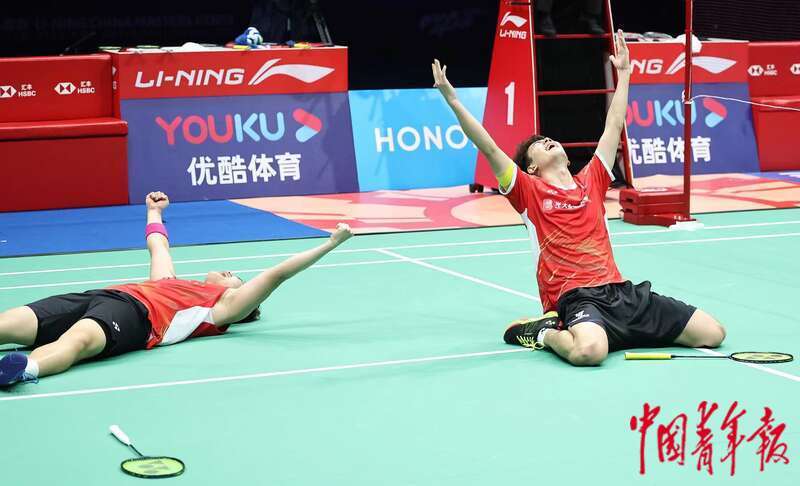 11月26日,广东深圳,深圳湾体育中心,2023李宁·中国羽毛球大师赛混双决赛,中国组合郑思维(前)/黄雅琼庆祝夺冠。在混合双打决赛中,中国组合郑思维/黄雅琼发挥出色,展示了娴熟的配合和过硬的技术,以21:10和21:11的比分,2:0战胜韩国组合徐承宰/蔡侑玎,夺得冠军。刘占崑/摄