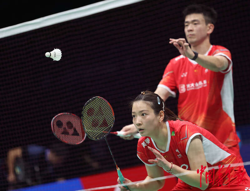11月26日,广东深圳,深圳湾体育中心,2023李宁·中国羽毛球大师赛混双决赛,中国混双选手黄雅琼(前)、郑思维在比赛中。刘占崑/摄